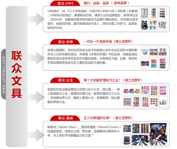 廣東聯眾文具有限公司由現任總裁施紅光先生創(chuàng)辦于1996年。自成立以來,聯眾公司一直專注于學生、辦公文具及新潮禮品的開發(fā)、設計、制造和銷售。目前,聯眾公司產品線涵蓋日常事務型文具、書寫工具、彩繪工具、精美套裝禮品、筆袋、筆盒、書包、水壺水杯、毛絨公仔等品類;品牌包括聯眾UME 系列、聯眾出奇蛋系列及迪士尼國際授權品牌系列。國內營銷網絡已覆蓋國內30個省市,并在北京、廣州、上海、南京、武漢、成都、西安、沈陽等八大城市設立了輻射全國的區(qū)域服務平臺。