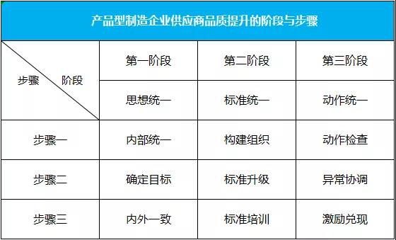 對于制造型企業(yè),供應商的品質(zhì)好壞,將直接的影響到產(chǎn)品交付時間和產(chǎn)品質(zhì)量,從而影響到產(chǎn)品的綜合成本。如何快速讓供應商的品質(zhì)明顯提升,本人根據(jù)實踐案例總結(jié)為三個階段共九個步驟,詳見下表: