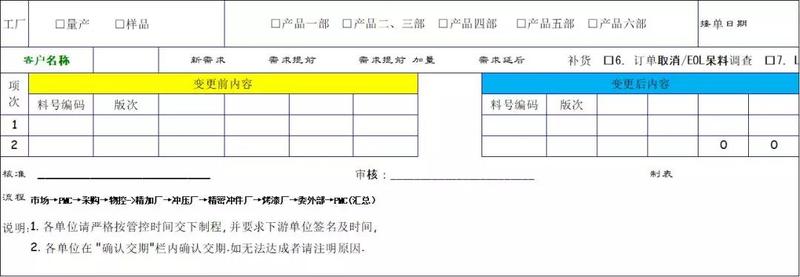 需求并非一成不變的,當(dāng)需求變更時(shí),則需對(duì)所變更的內(nèi)容發(fā)布相應(yīng)的《訂單變更通知單》,訂單變更通知單變更內(nèi)容需要注意以下要素: