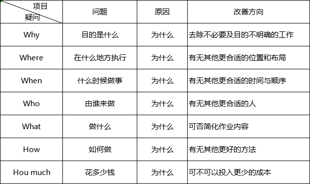 對現(xiàn)有的工作方案進(jìn)行考核分析的目的是為了建立新的工作方法和新的工作秩序,這樣就要求改善工作打破傳統(tǒng)的工作方式,靈活運(yùn)用以下五大原則對現(xiàn)行的工作方法進(jìn)行革新。如表所示: