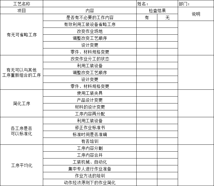 產(chǎn)品工藝分析檢查表將工作中可能涉及的問題進(jìn)行了匯總,這樣大大簡化了思考過程,使分析過程變得更直觀、更簡便。產(chǎn)品工藝分析的內(nèi)容可以根據(jù)分析者的需要自行設(shè)計(jì),如表所示:
