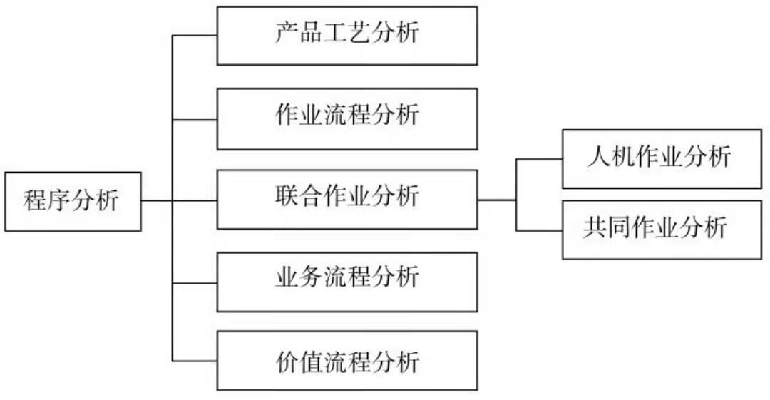 程序分析按分析對象不同,分為以產(chǎn)品工藝為中心的產(chǎn)品工藝分析和以人為中心的作業(yè)流程分析,同時(shí)為表達(dá)操作者與機(jī)械之間的作業(yè)程序或多名操作者之間的作業(yè)程序,又有聯(lián)合作業(yè)分析。其中聯(lián)合作業(yè)分析又因作業(yè)的對象不同分為作業(yè)人員分析法和共同作業(yè)分析法。