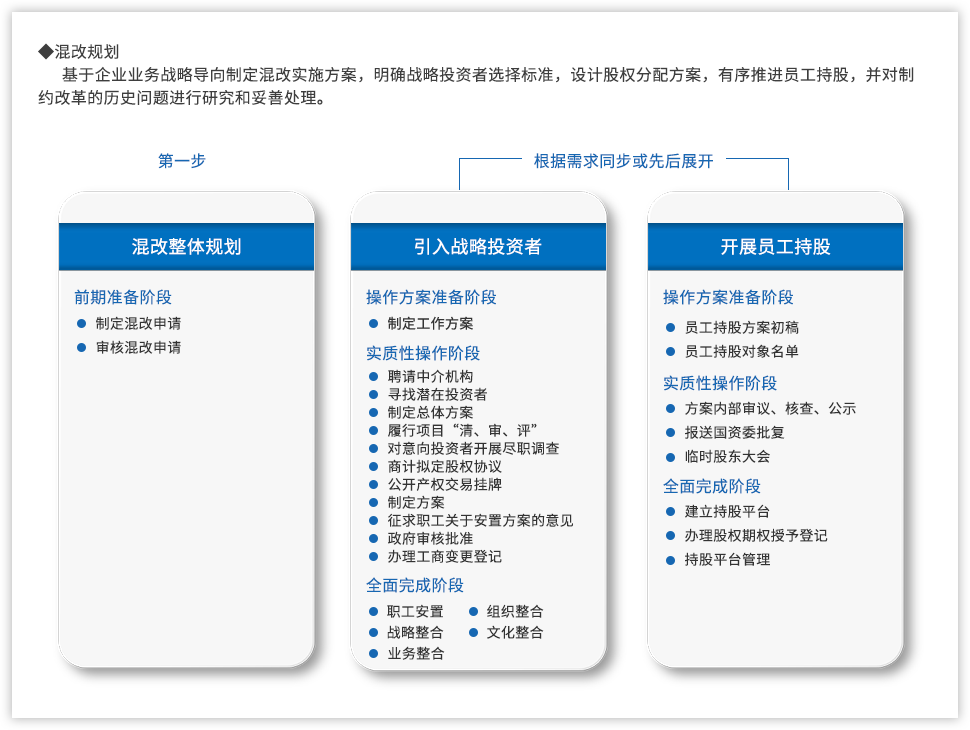 黨的十九大報告指出:“要深化國有企業(yè)改革,發(fā)展混合所有制經(jīng)濟(jì),培育具有全球競爭力的世界一流企業(yè)”;當(dāng)前,隨著國企改革“雙百行動”、區(qū)域性國資國企綜合改革試驗(yàn)、“科改示范行動”、第三批以及第四批混改試點(diǎn)的實(shí)施,國企改革由點(diǎn)向面梯次鋪開、范圍逐步擴(kuò)大,并呈現(xiàn)明顯加速,國有企業(yè)改革進(jìn)入“深水區(qū)”。追本溯源,國企改革到底怎么改,回到國有企業(yè)改革的初衷我們認(rèn)為,國有企業(yè)改革是以混和所有制為手段,在堅持黨的領(lǐng)導(dǎo)下建立現(xiàn)代企業(yè)制度,優(yōu)化管理關(guān)系,創(chuàng)新管理機(jī)制,激發(fā)員工活力,從而最終實(shí)現(xiàn)國有企業(yè)的持續(xù)發(fā)展?;旄穆鋵?shí)到具體實(shí)踐中,便處處是難點(diǎn)。遠(yuǎn)大方略認(rèn)為,混改的重點(diǎn)已經(jīng)從以“政策研究+方案制定”為主轉(zhuǎn)變到以化解落地過程中的實(shí)際痛點(diǎn)為主,從剖析“為什么混、和誰混、怎么混”轉(zhuǎn)變?yōu)槁鋵?shí)治理結(jié)構(gòu)、戰(zhàn)略協(xié)同以及激勵機(jī)制等深層次問題。