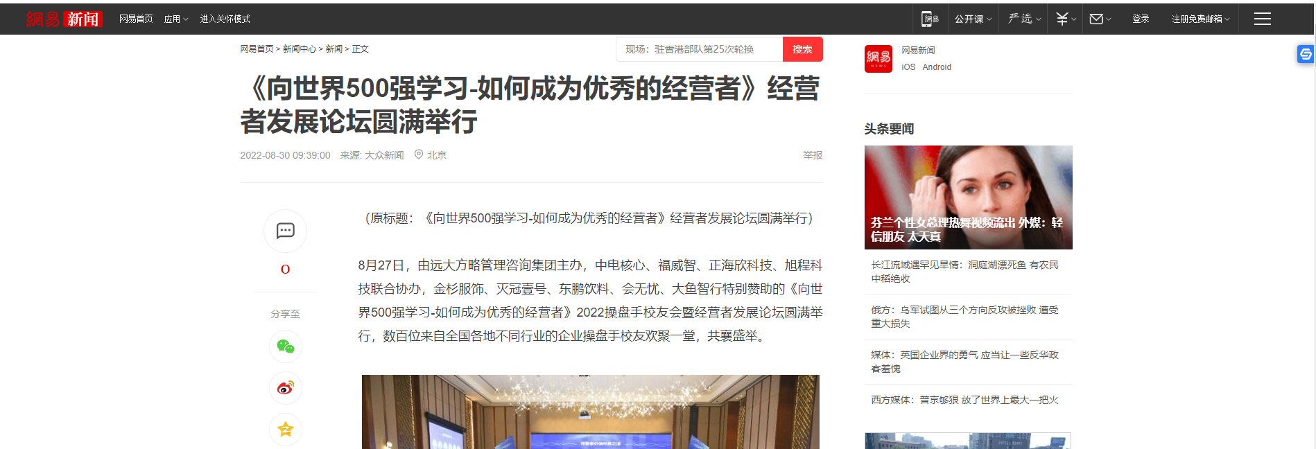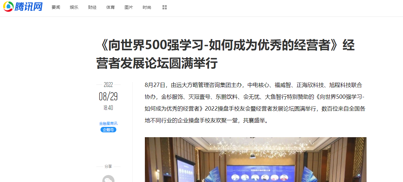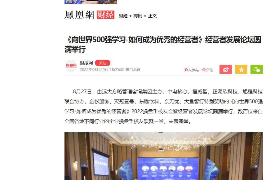 8月27日,由遠大方略管理咨詢集團主辦,中電核心、福威智、正海欣科技、旭程科技聯(lián)合協(xié)辦,金杉服飾、滅冠壹號、東鵬飲料、會無憂、大魚智行特別贊助的《向世界500強學習-如何成為優(yōu)秀的經(jīng)營者》2022操盤手校友會暨經(jīng)營者發(fā)展論壇圓滿舉行,數(shù)百位來自全國各地不同行業(yè)的企業(yè)操盤手校友歡聚一堂,共襄盛舉。