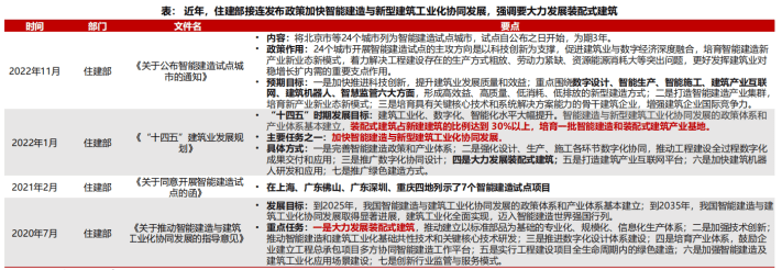 從國家政策上看,2020年7月發(fā)布了《關(guān)于推動智能建造與建筑工業(yè)化協(xié)同發(fā)展的指導(dǎo)意見》;2021年2月發(fā)布了《關(guān)于同意開展智能建造試點(diǎn)的函》;2022年1月發(fā)布了《“十四五”建筑業(yè)發(fā)展規(guī)劃》;2022年11月發(fā)布了《關(guān)于公布智能建造試點(diǎn)城市的通知》。住建部正在穩(wěn)步推進(jìn)智能建造,“十四五”建筑業(yè)發(fā)展規(guī)劃提出要求裝配式建筑占新建建筑的比例達(dá)到 30%以上,培育一批智能建造和裝配式建筑產(chǎn)業(yè)基地,裝配式建筑將成為主要的發(fā)力點(diǎn)。在“雙碳”的背景之下,建筑行業(yè)作為“碳排放大戶”,“碳達(dá)峰”任務(wù)的主要抓手,擁有碳減排的空間極大,將會成為節(jié)能減排的重要節(jié)點(diǎn)。