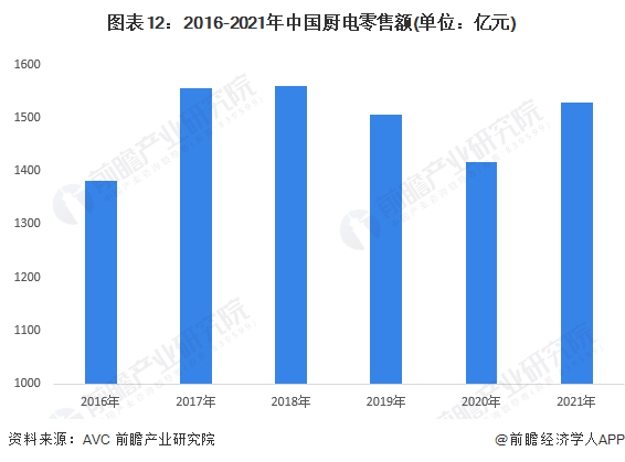 2016-2021年中國(guó)廚電零售額波動(dòng)變化,其中2018年達(dá)到最近4年最高值為1559億元,2019年起有所下降,2021年達(dá)到1528億元,較2020年增長(zhǎng)約7.9%。