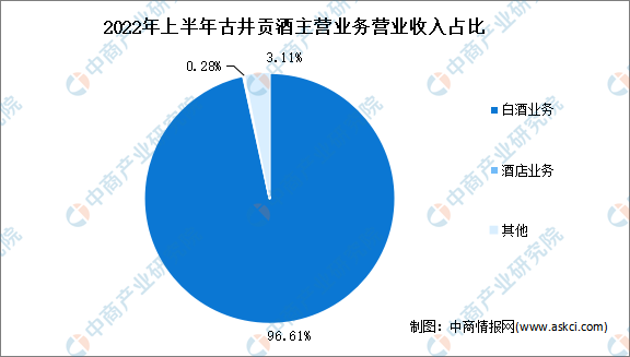 從主營業(yè)務來看,2021年古井貢酒主營白酒業(yè)務、酒店業(yè)務,營業(yè)收入占比分別為96.61%、0.28%。