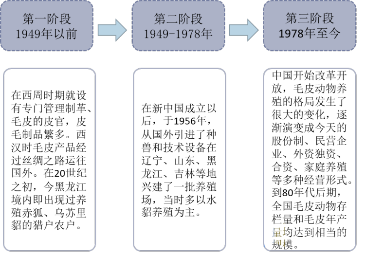 我國毛皮行業(yè)發(fā)展較早,早在西周時(shí)期就設(shè)有專門管理制革、毛皮的皮官,皮毛制品繁多。西漢時(shí)毛皮產(chǎn)品經(jīng)過絲綢之路運(yùn)往國外。在20世紀(jì)之初,今黑龍江境內(nèi)即出現(xiàn)過養(yǎng)殖赤狐、烏蘇里貂的獵戶農(nóng)戶。而在新中國成立以后,于1956年,從國外引進(jìn)了種獸和技術(shù)設(shè)備在遼寧、山東、黑龍江、吉林等地興建了一批養(yǎng)殖場,當(dāng)時(shí)多以水貂養(yǎng)殖為主。1978年,中國開始改革開放,毛皮動(dòng)物養(yǎng)殖的格局發(fā)生了很大的變化,逐漸演變成今天的股份制、民營企業(yè)、外資獨(dú)資、合資、家庭養(yǎng)殖等多種經(jīng)營形式。到80年代后期,全國毛皮動(dòng)物存欄量和毛皮年產(chǎn)量均達(dá)到相當(dāng)?shù)囊?guī)模。