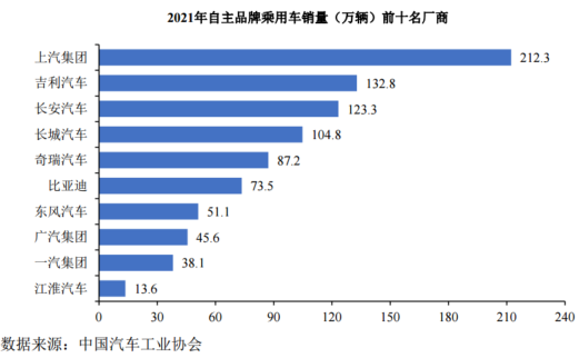根據(jù)中國汽車工業(yè)協(xié)會統(tǒng)計,2021年中國自主品牌乘用車銷量前十名廠商分別為:上汽集團、吉利汽車、長安汽車、長城汽車、奇瑞汽車、比亞迪、東風汽車、廣汽集團、一汽集團和江淮汽車,合計銷售乘用車882.3萬輛,占自主品牌乘用車銷量占比約92.46%,在中國乘用車總銷量中占比約41.07%。