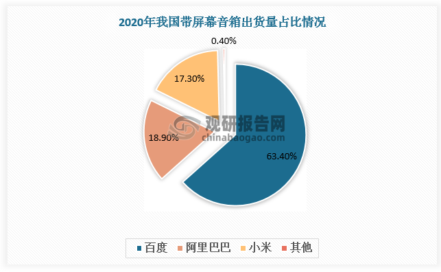 帶屏幕音箱市場(chǎng)中,百度憑借優(yōu)越的人工智能語音技術(shù),出貨量占比最大,2020年為63.4%;其次是阿里巴巴和小米,帶屏幕音箱出貨量占比18.9%、17.3%。
