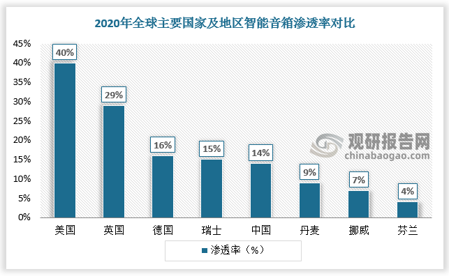 2017-2020年,國(guó)內(nèi)智能音箱市場(chǎng)零售額由4.9億元增長(zhǎng)至74億元,2021年H1我國(guó)智能音箱行業(yè)市場(chǎng)規(guī)模達(dá)46.5億元,較上年同期增長(zhǎng)30.6%,我國(guó)智能音箱進(jìn)入迅猛增長(zhǎng)階段。但從滲透率來看,2020我國(guó)智能音箱滲透率(14%)排名全球第五,銷售規(guī)模仍有較大的提升空間。未來,隨著智能音箱廠商向下沉市場(chǎng)拓展,預(yù)計(jì)2023年我國(guó)智能音箱銷售額達(dá)到174.2億元。