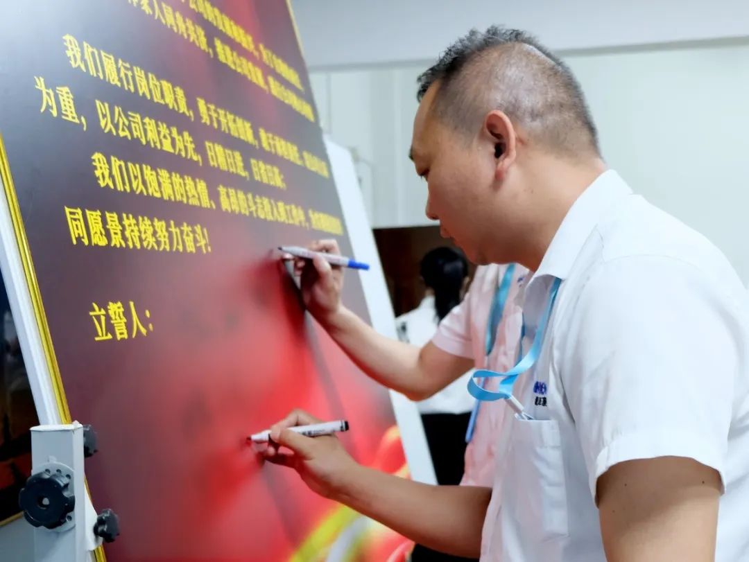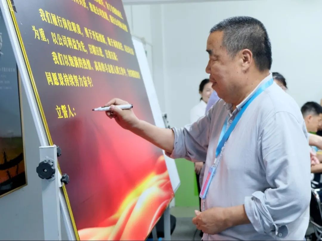 會(huì)上,萬(wàn)總為項(xiàng)目老師頒發(fā)了授權(quán)書(shū)和聘書(shū),帶領(lǐng)項(xiàng)目關(guān)鍵人員在誓詞上簽字并集體宣誓,鼓勵(lì)大家和公司共同成長(zhǎng)進(jìn)步。