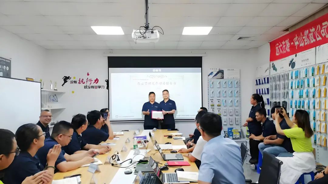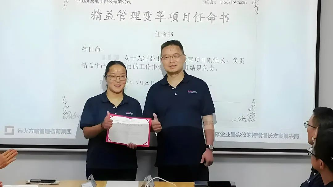 為促進(jìn)項目的有效落地,此次改善還成立了專項改善小組,明確各崗位職責(zé),強化責(zé)任意識,會上王總為遠(yuǎn)大方略顧問團(tuán)頒發(fā)授權(quán)書,為精益改善小組成員頒發(fā)了任命書。